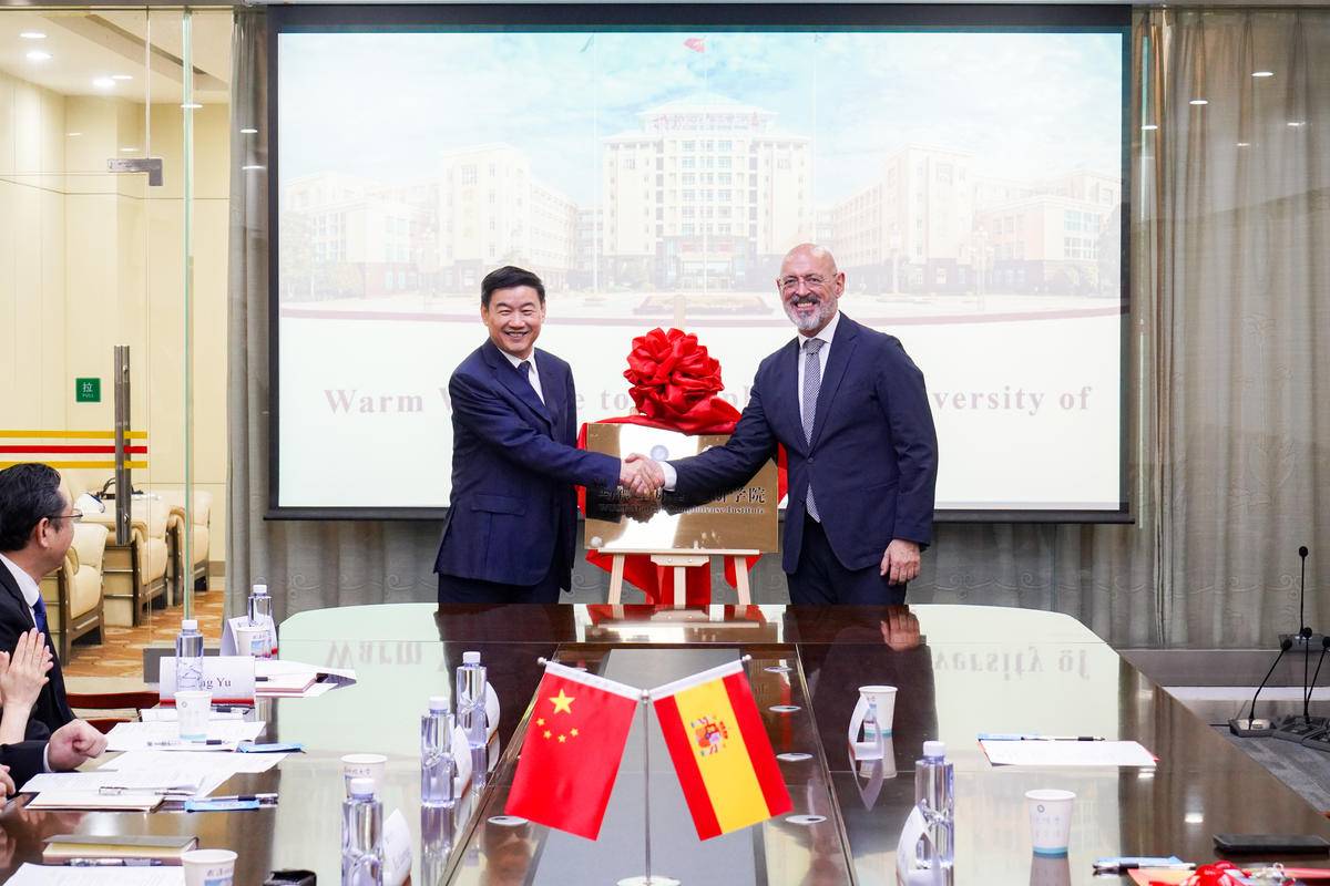 (yabo鸭脖官网党委书记徐雁冰与马德里康普顿斯大学校长华金·戈亚奇·戈尼为学院揭牌。摄 覃宇)