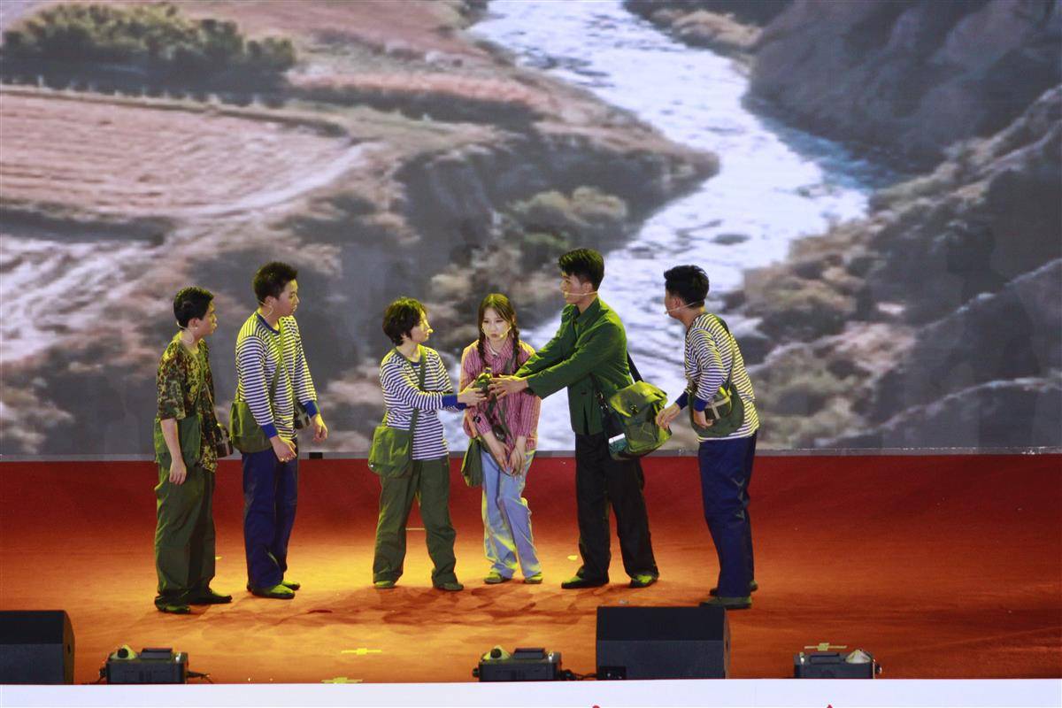 演出现场,生锈的二八大杠自行车、掉漆的军绿色水壶、发白的学生装……一件件“老物件”将观众的思绪拉回到上世纪八十年代。时空跳转,历史与现实交织,在热血激昂的背景声与声情并茂的朗诵声中,演员们身着工装、手拿图纸、挥动铁铲,演绎着万里西北行的动人故事。