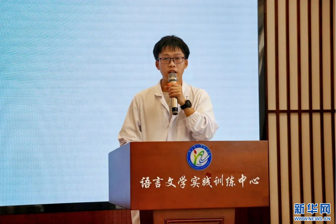武汉大学第24届研究生支教团队员秦天在宣讲中,回顾了自己出生于贫困县,在党和国家的关心下,顺利完成学业,并投身西部计划,赴新疆博尔塔拉蒙古自治州博乐市支教的事迹。