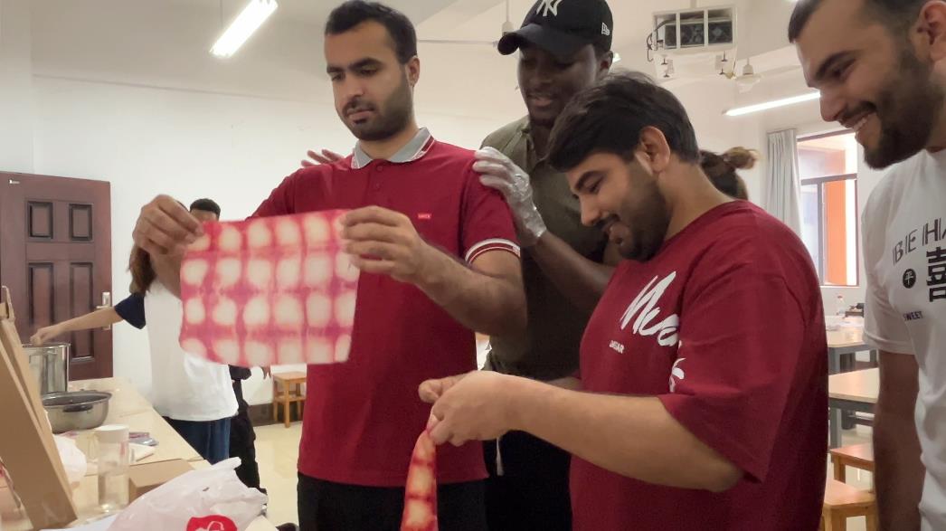 扎染工艺区,靛蓝染液氤氲升腾,师生团队现场演绎“扎结防染”精髓:“不同束缚,成就万千留白。”留学生们巧手翻飞,折叠、拧绞、捆扎布料,浸入染锅。十几分钟后解开线绳,深浅不一的蓝白纹样如泼墨山水般晕染开来,或似抽象几何,各具神韵。巴基斯坦留学生KHAN MAJID展示方巾,难掩惊喜:“原来简单的捆绑,就能创造出独一无二的艺术效果,太不可思议了!”