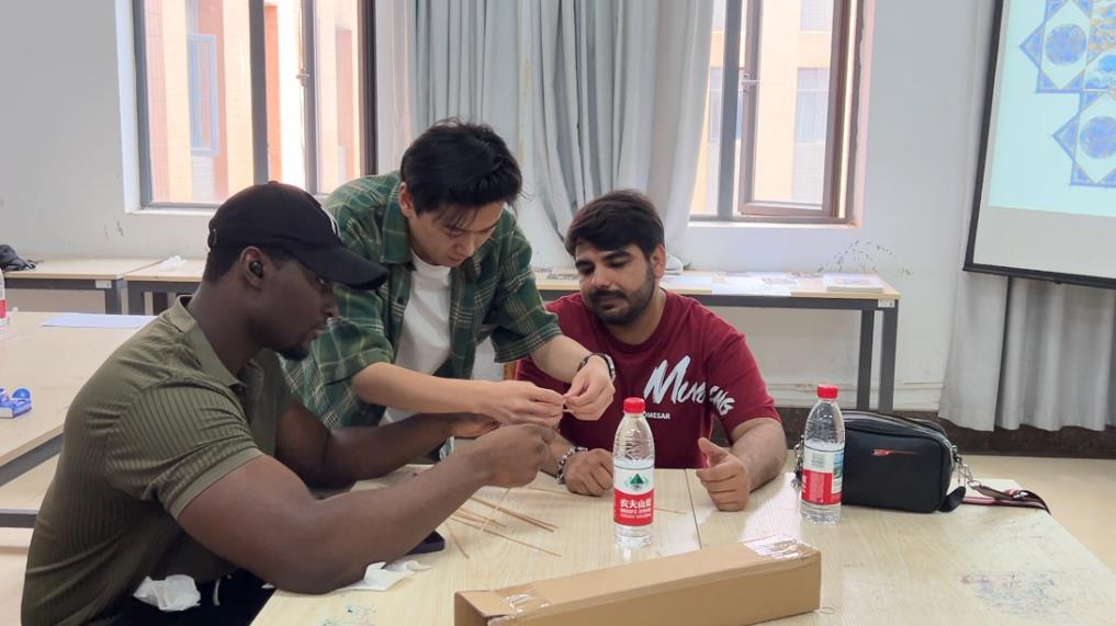 板鹞风筝制作区里,师生团队准备了竹条、棉线、宣纸等材料,留学生们在指导下打磨竹条、弯制定型、绷线固架,并在宣纸上精心描绘凤凰、祥云等传统纹饰。组装环节,师生详解“哨口”位置对音色之影响,留学生们屏息凝神,细致调整。赞比亚留学生JACKSON MSAFIRI MBILU完成作品后深有感触:“从选材到绘图,每一步都饱含对自然的敬畏与顺应,传统工艺蕴藏的智慧令人叹服。”