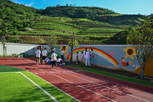 从高扁小学操场望去,志愿者钱多多正专注地绘制墙面,村民在墙后的山坡采摘辣椒,微风吹过,红旗飘扬,乡村振兴的美好蓝图正徐徐展开。