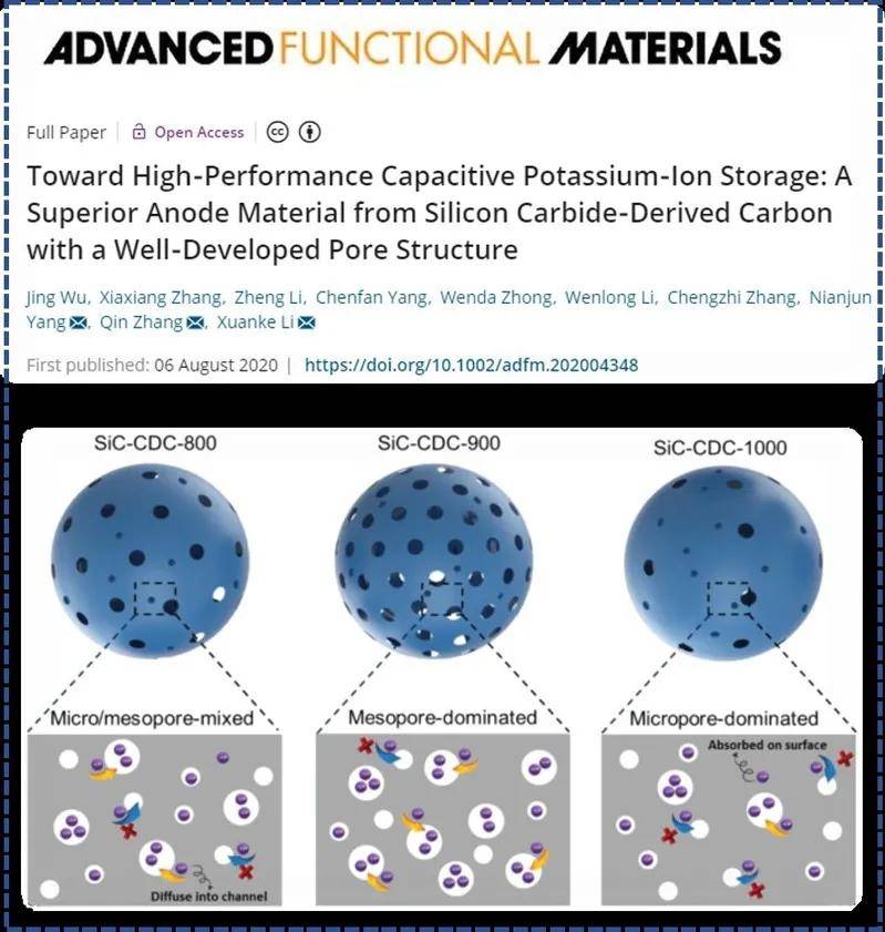 自2020年以来,李轩科教授团队已在储能及催化领域发表了一系列优秀成果。在钾离子电池领域,通过控制刻蚀温度,合成了具有可控孔结构的碳化硅衍生碳材料,实现电容性储钾,并以题为“Towards High-performance Capacitive Potassium-ion Storage: A Superior Anode Material from Silicon Carbide Derived Carbon with a Well-developed Pore Structure”(10.1002/adfm.202004348)的研究性论文发表在国际著名期刊Advanced Functional Materials(影响因子16.836)上。
