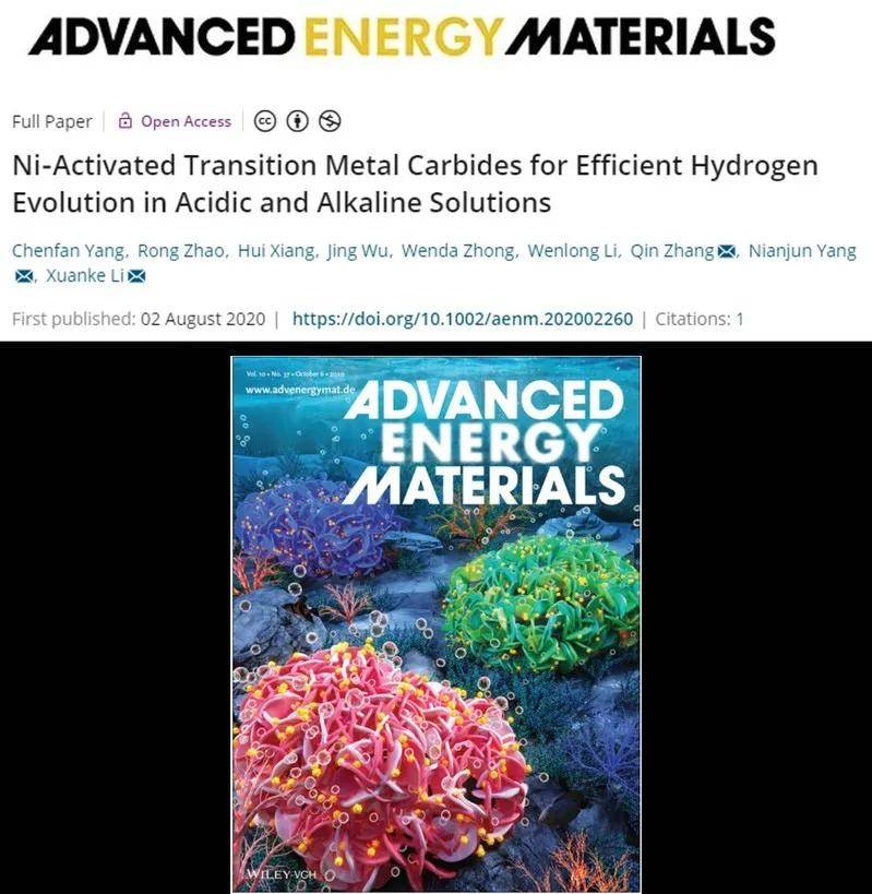 此外,团队近期在电催化领域也取得了系列成果。他们提出了一种具有普适性的活化策略来提高碳化物的催化析氢性能,在国际著名期刊Advanced Energy Materials(影响因子25.245)上发表了题为“Ni‐Activated Transition Metal Carbides for Efficient Hydrogen Evolutionin Acidic and Alkaline Solutions”(10.1002/aenm.202002260)的封面文章。受前面工作启发,他们又利用界面电子结构重排以实现高催化活性,在Journal of Energy Chemistry(影响因子7.216)发表了题为“Interfacial electron rearrangement: Ni activated Ni(OH)2 for efficient Hydrogen evolution”的研究工作。