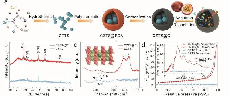 由于钠的储量丰富,钠离子电池(SIBs)比锂离子电池(LIBs)具有更高的成本竞争力。但钠离子的半径、重量比锂离子大,SIBs实际比能量和寿命略低于LIBs。因此,开发高容量、结构稳定的电极将是SIBs实现大规模工业化应用的关键。针对上述问题,李轩科教授团队设计并合成了具有类似百香果结构的碳修饰Cu2ZnSnS4,该复合材料可实现嵌入-转化-合金化的多电子快速转移反应,同时,具有高效、稳定的电化学离子/电子传输路径,能有效缓解充放电过程中电极材料的体积膨胀问题,从而实现持久、快速的钠离子存储。
