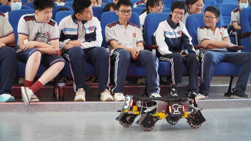现场,学生实践操作“英雄”和“工程”机器人左右平移、发射弹丸、上下阶梯。在该校崇实战队队员刘玉博引导下,819班学生杨茗媛缓慢推动操纵杆,机器人便轻盈地移动起来;轻触红色按钮,弹丸便能随着轮轴传动,精准命中目标。学生崔建康感叹道:“这些机甲太酷了,我也想要学习无人技术。”