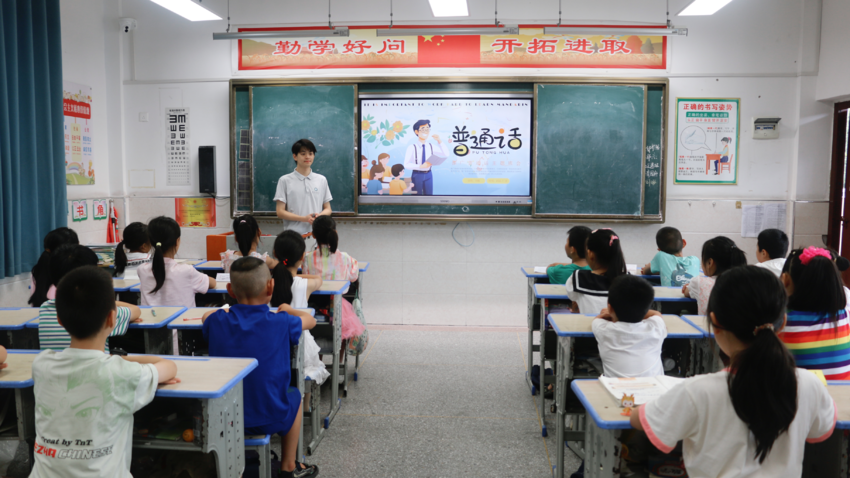 湖北日报客户端讯(通讯员张娅菲、周文君)为响应第28届全国普通话宣传周“加大国家通用语言文字推广力度,促进铸牢中华民族共同体意识”的号召,7月18日,yabo鸭脖官网外国语学院“梦载星河”暑期社会实践团队走进湖北省十堰市郧西县香口乡中心学校,为桑梓三班的孩子们带来了一堂生动有趣的普通话推广课程。实践队队长刘烁通过寓教于乐的方式,将普通话的种子播撒进乡村孩子的心中,助力他们架起通向更广阔世界的语言之桥。