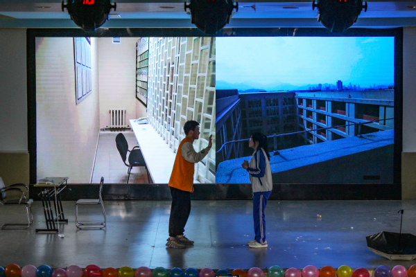 计算机学院带来首发表演《重生之康哥立棍》,该话剧以偶像剧式夸张情节开头,融合 “99次表白”“火锅代金券”“校霸校姑”等网络热词提高作品趣味性,结尾“女主”拉下假发的动作引起了全场欢笑。从表白被拒、室友安慰、诈骗转账到跳楼重生,剧情一步步走向高潮。
