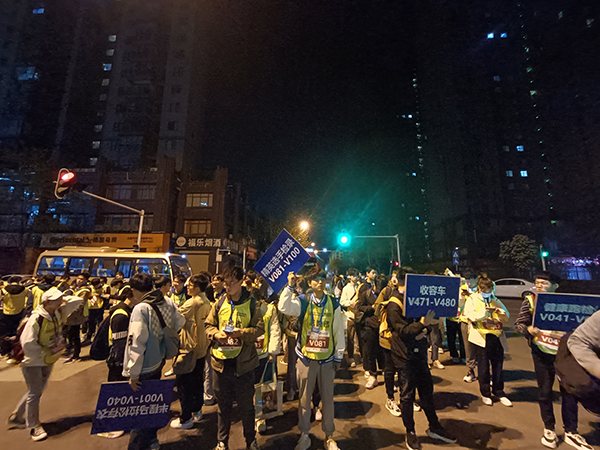凌晨3点半,鸭脖黄家湖校区的658名志愿者驱车20km,于凌晨5点抵达赛事现场,与青山校区的52名志愿者集结。各赛道入场处,检录组志愿者仔细核对参赛者信息并提供指引。距比赛开始半小时,人墙志愿者手拉手,将参与比赛的不同组别分隔开,以维持秩序。早晨7:30,半程马拉松正式鸣枪开跑,210名医疗志愿者每隔100米分别排开,随时待命,为路过的志愿者提供医疗救助。补给组则将饮料和矿泉水分发到每一个塑料杯,以方便跑者补充水分。