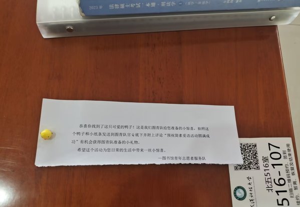 活动中,志愿者分三批共投放了30个小黄鸭,分布地点包括图书馆周边以及馆内桌椅上。每天早上来到图书馆的学生就有机会发现前一天潜藏在图书馆的小惊喜。“一大早就在我一直自习的位置上发现了一直只小黄鸭,那一整天我的心情和学习状态都很好”正在备考2024年研究生的周行说道。“小黄鸭既带有诙谐色彩,又充满着正能量,我们希望能用这种方式给大家的学习生活增添一些喜悦和动力。”图书馆志愿者高逸飞谈道。
