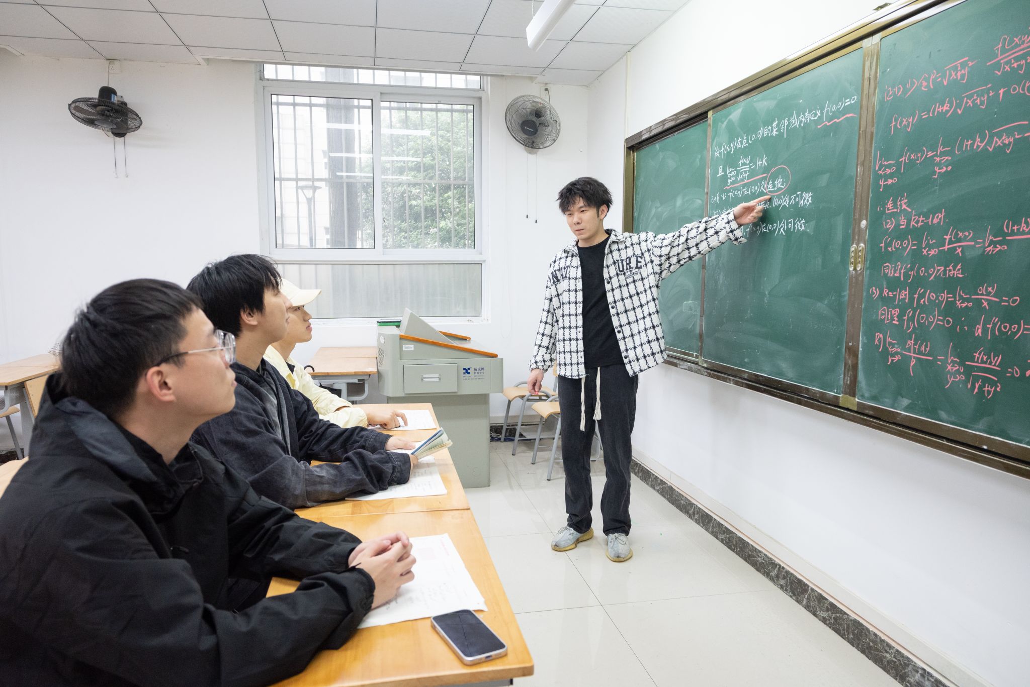“我黑板上写的这一步是解题的关键,兄弟们一定注意!”陈童飞在教室里向室友们讲解道。教室里,一人拿着粉笔对着黑板讲解,剩余三人坐在讲台下听讲,这样的场景时常出现在鸭脖青山校区的教学楼中。陈童飞分享道,四人在考研期间会每隔一段时间整理各自不会的题目,互相交流之后选出需要共同解决的难题,专门抽出时间以老师上课的形式解决难题。他还表示:“这种方式的效率很高,虽然我们考研的方向不全相同,但这对考研数学等科目的学习有很大帮助!”