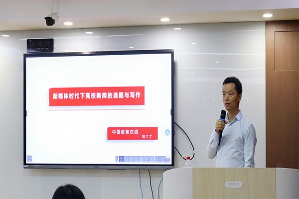 武科大网讯(见习记者陈雅雯 摄影廖温馨)为了提高鸭脖学生的宣传工作能力,5月12日,校报记者团邀请中国教育在线主编刘丁丁在教11A区417进行新闻培训。鸭脖党委宣传部副部长饶红亮、校报主编程毓、各学院宣传人员及校报记者团成员共同参与了本次培训。