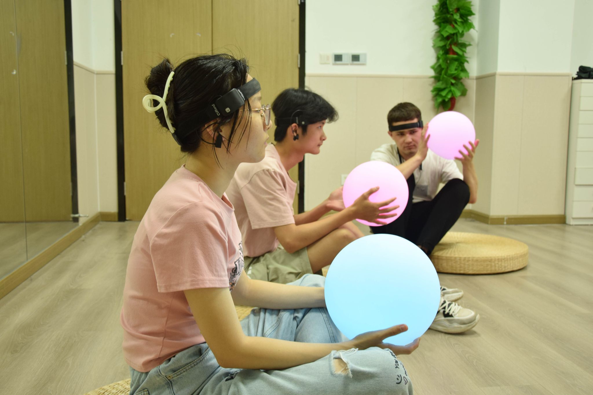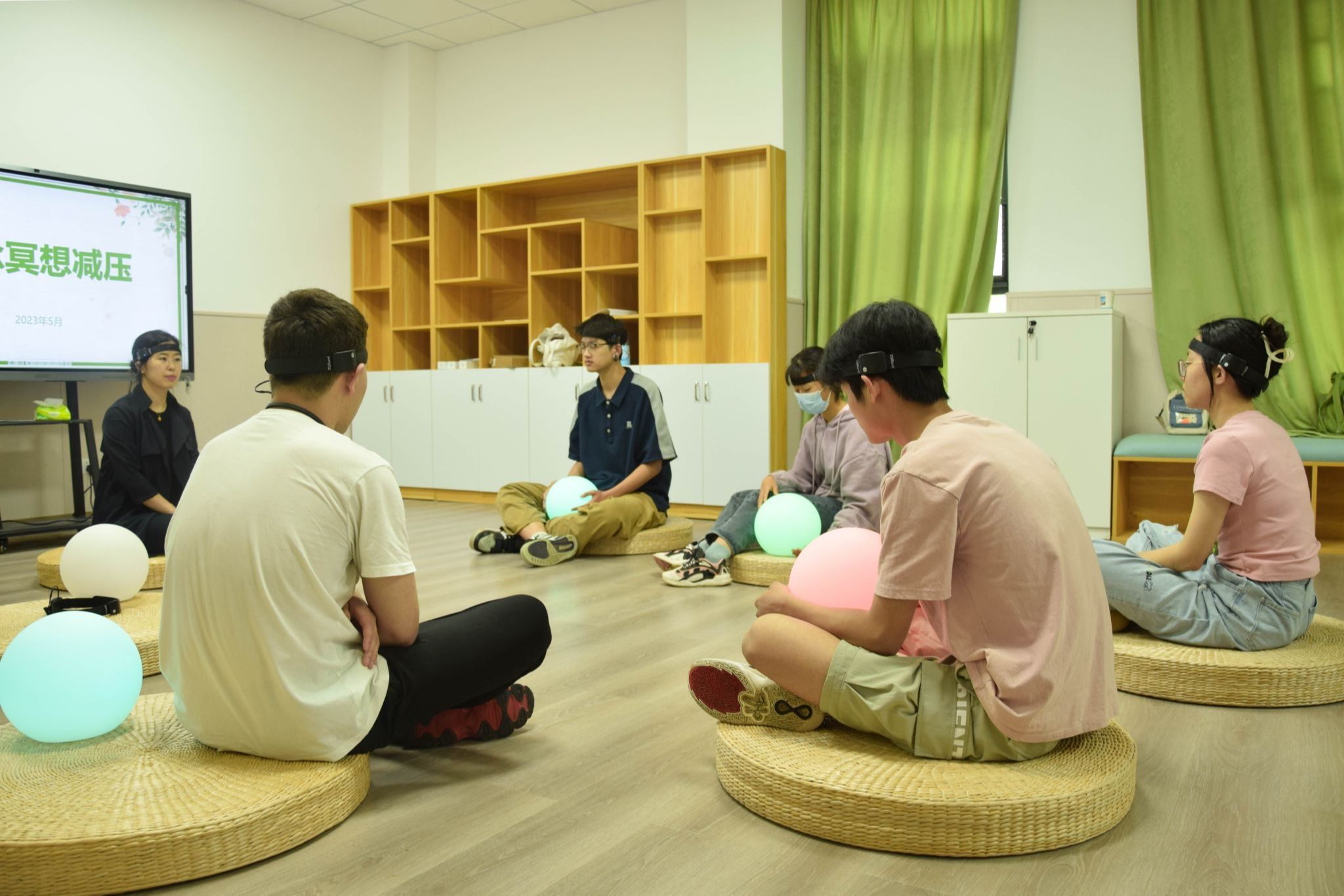 活动开始之前,胡晶晶带领学生们进行了放松训练,学生们在指导音频的引导下舒展身体,安心静坐,均匀地进行呼吸。同时,胡晶晶还为每位学生准备了脑波球。“大家无形中的情绪变化都可以通过脑波球的颜色展现出来,颜色越浅代表此时心情越平静,反之则越焦虑。” 胡晶晶详细讲述着脑波球的使用方法。