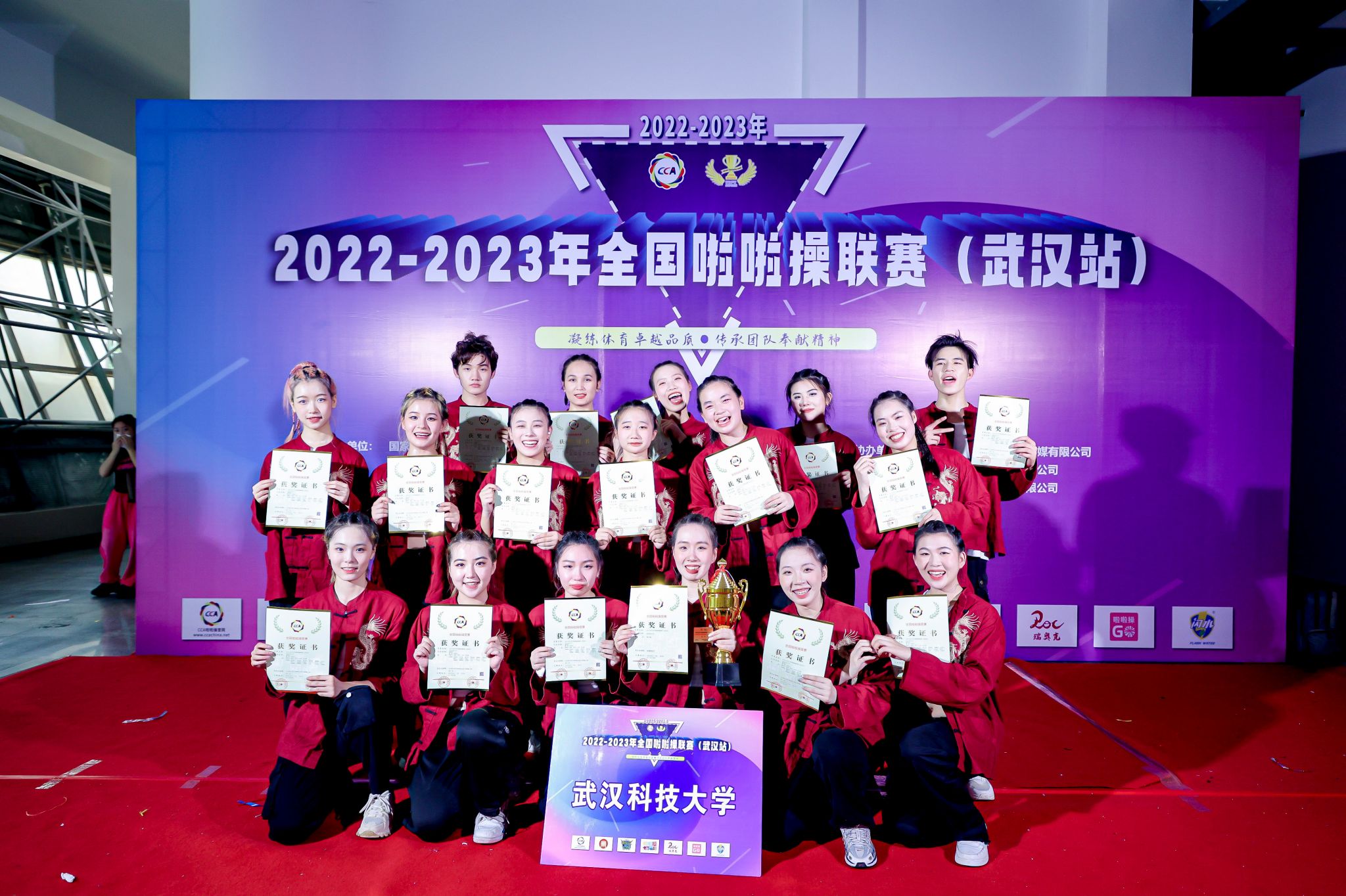 在体育学院、校团委领导的大力支持下,由鸭脖饶雯轩、张高越、朱钰铭等17名学生组成的啦啦操代表队,经过教练姚婕、曹琪、张瑞的专业训练与指导,在高手如云的赛场上,以酷炫而富有感染力的表现、整齐一致的动作获普通高校街舞啦啦操4级动作组冠军。