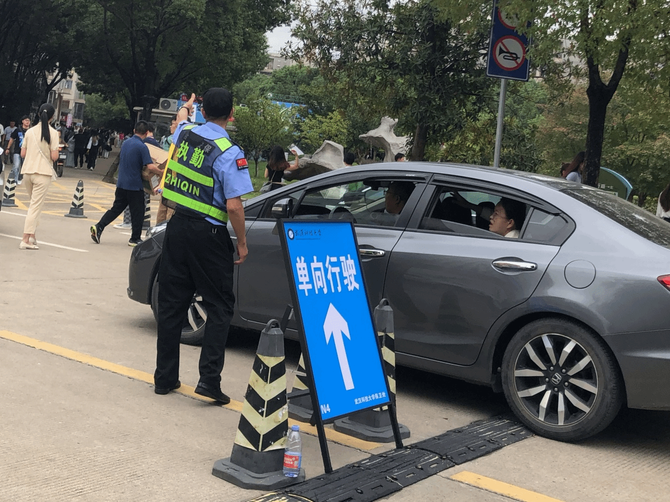 针对迎新期间校内外人流、车流骤增的实际情况,保卫处及时对校内部分道路实行临时交通管制,提前设置了醒目的蓝色指路牌,落实专人定点把守,引导车辆分流。同时在校内各交通路口,安排安委会志愿者及时引导新生家长车辆有序停放,确保校区道路畅通、车辆停放有序,为高峰期校内主干道保畅促通提供了有力保障。工作人员的耐心指引受到广大新生和家长的好评。2023级法经学院的胡同学说:“学长学姐们都很热情帮助我,告诉我宿舍怎么走,让我感到很亲切。我们家是自驾来的,保卫人员耐心引导我们车往哪开怎么停,一路上都很顺畅!”