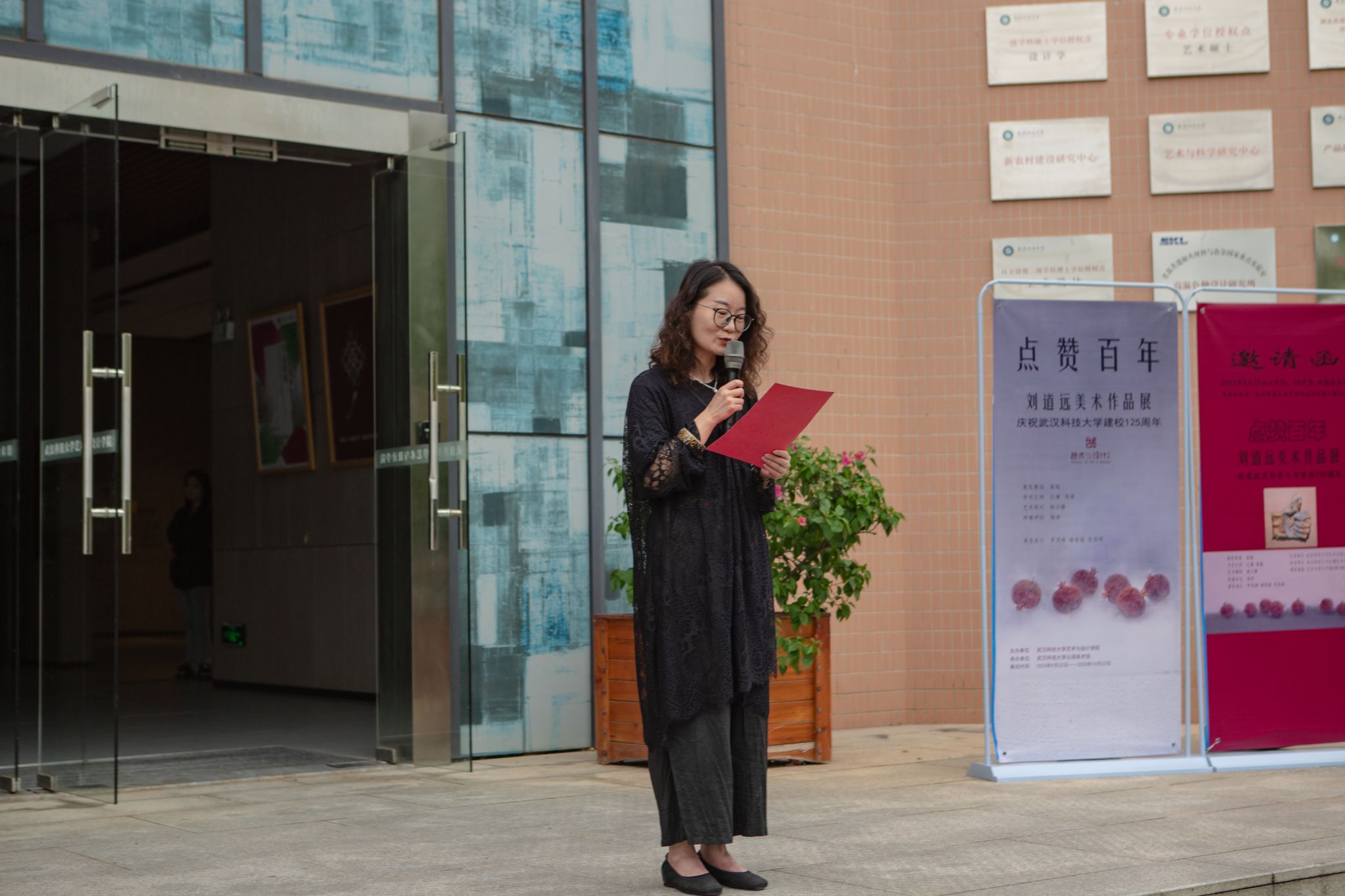 周薇向与会人员简短地讲述了刘道远的从艺经历,并介绍了出席开幕式的各位领导 和嘉宾。她对刘道远此次回到母校举办“点赞百年 ”美术作品展,表示充分的赞赏和支持。