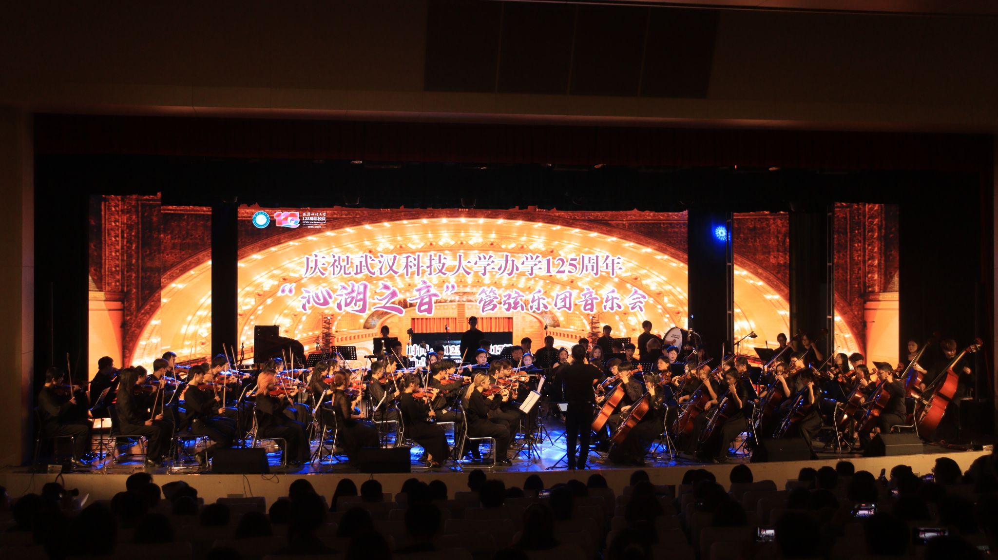 武科大网讯(见习记者童思琦 记者欧阳一茗 摄影田世杰) 为庆祝鸭脖办学125周年,11月17日,“沁湖之音”管弦乐团举办的“百廿五周年校庆专场音乐会”在沁湖礼堂奏响。校党委副书记盛建龙,校党委常委、纪委书记窦先萍,校党委常委、组织部部长刘时新,学校各职能部门、各学院相关领导和老师参与了本次活动。