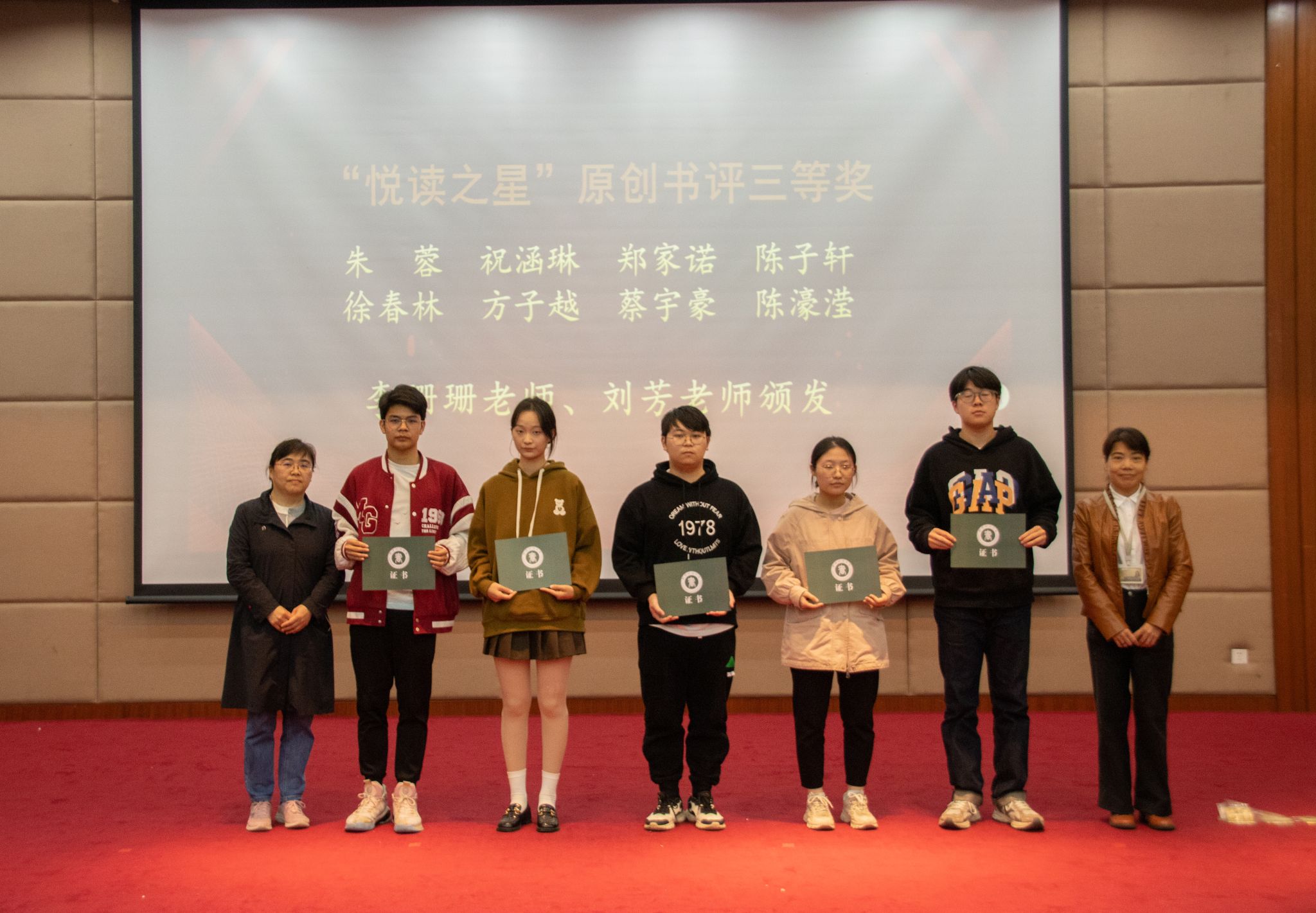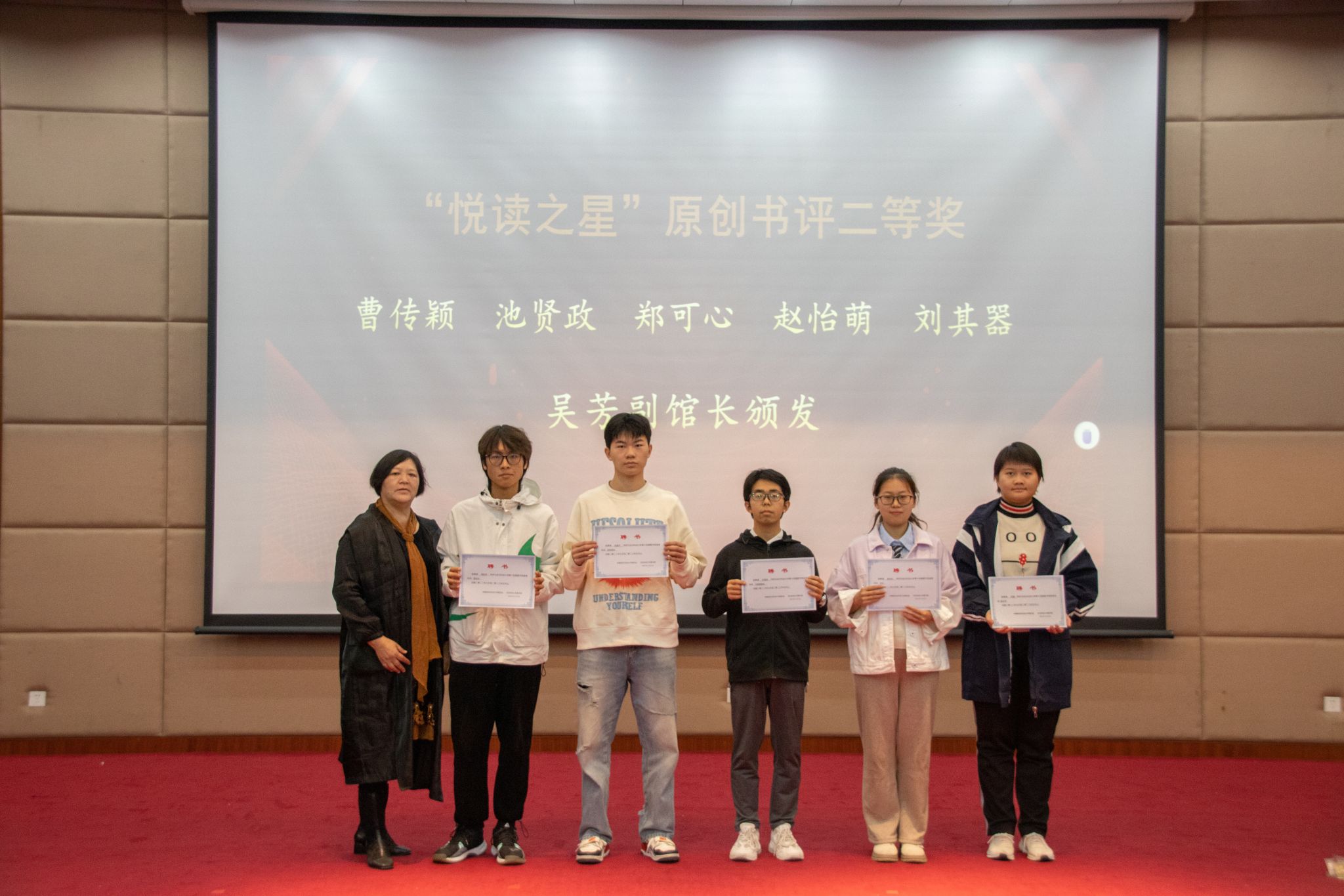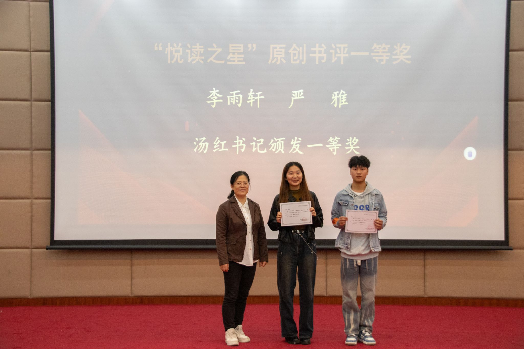 主持人宣读表彰决定,外国语学院、管理学院、信息学院、图书馆、校史馆、青年志愿者服务队在此次活动中获得优秀组织奖,15人在“悦读之星”原创书评中获奖,其中李雨轩、严雅2人获一等奖,曹传颖、池贤政、郑可心、赵怡萌、刘其器5人获二等奖,朱蓉、祝涵琳、郑家诺等8人获三等奖。