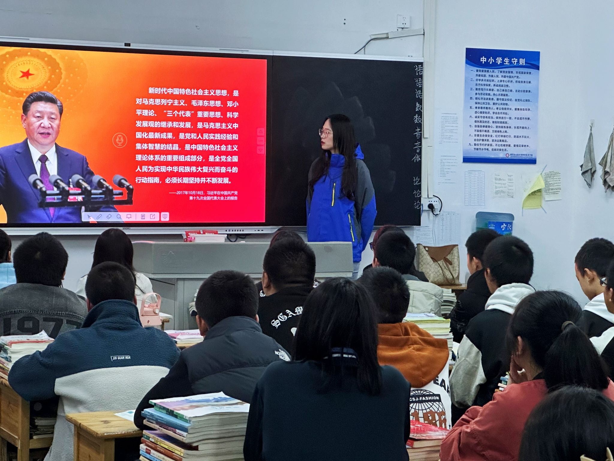 崔书闻就习近平新时代中国特色社会主义思想是立足时代之基、回答时代之问的科学理论为学生们进行讲解。“习近平新时代中国特色社会主义思想是在科学社会主义焕发新生机、两种社会制度的较量呈现新态势的时代背景下形成的,具有时代性和创新性,学习习近平讲话的重要内容,有利于同学们把握时代新形势,增强自身责任意识和使命感。”崔书闻讲道。