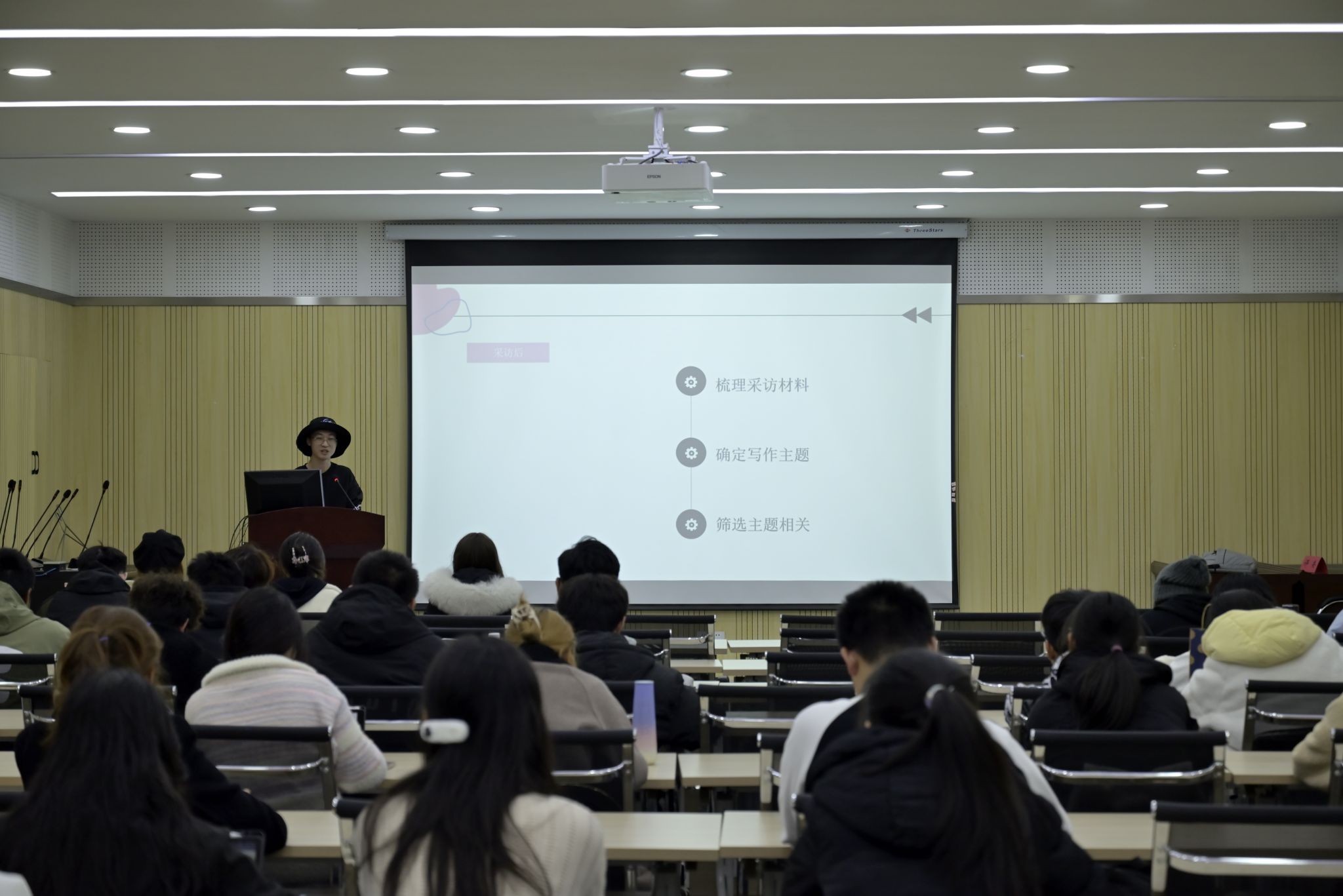 陈雅雯从活动稿和人物通讯稿的写作内容出发,介绍了活动稿写作时要注意短、实、新、活,要见人见事,多用动词名词去展现活动场面;人物通讯稿写作要根据采访对象设计一些针对提问,通过言语去写人物,从而挖掘采访对象的闪光点。
