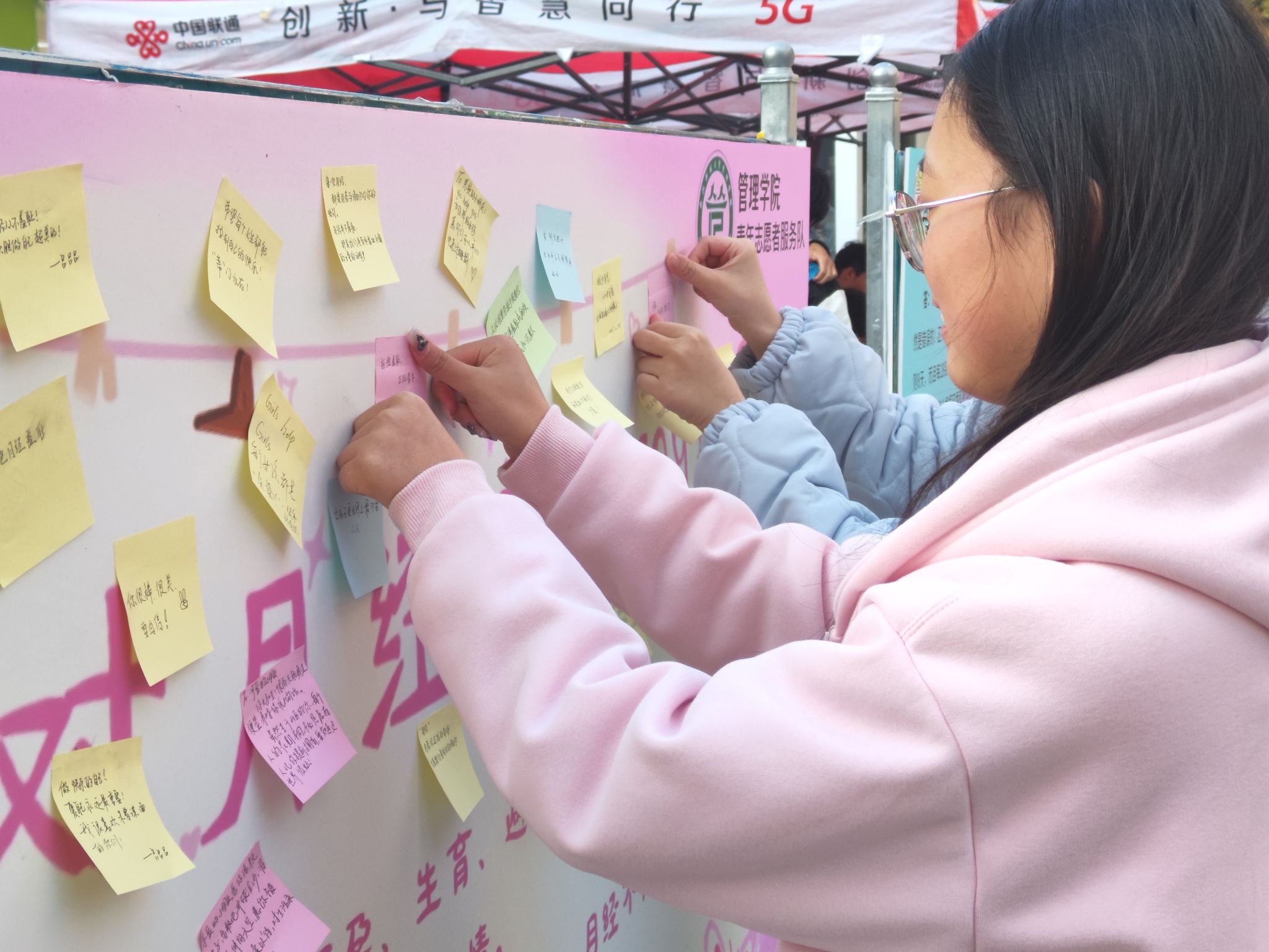 软产2201吴冰妮被活动的气球展板吸引过来,在志愿者的带领下,她先是参观了“月经”知识科普板,然后在便利贴上写下了“你最重要的事,就是好好爱惜自己。”的祝福语并贴在了互动板上。“科普里面的很多知识我也不知道。”吴冰妮感慨道,“想到这里,我越发觉得这个活动很有必要,远方还有很多‘花朵’正缺乏爱护。”在活动登记表里,吴冰妮除购买了卫生巾外,还额外捐赠了50元。