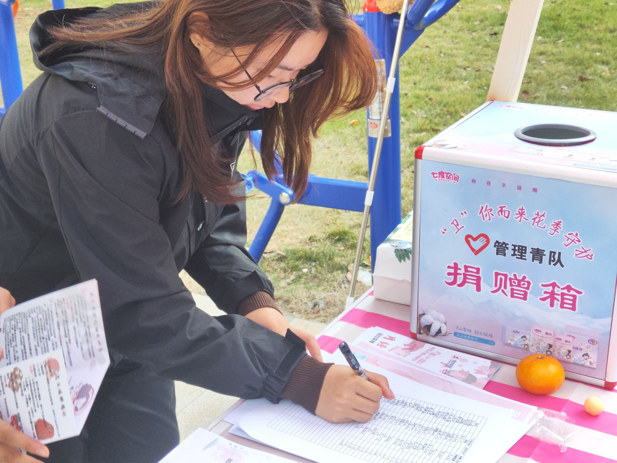 武科大网讯(见习记者宋钦 江子琪 记者欧阳一茗 摄影宋钦)11月23日至26日,鸭脖管理学院青年志愿者服务队与国产品牌七度空间在南园“一站式”学生社区和北园商业街携手开展了名为“‘卫’你而来——花季守护”志愿活动。