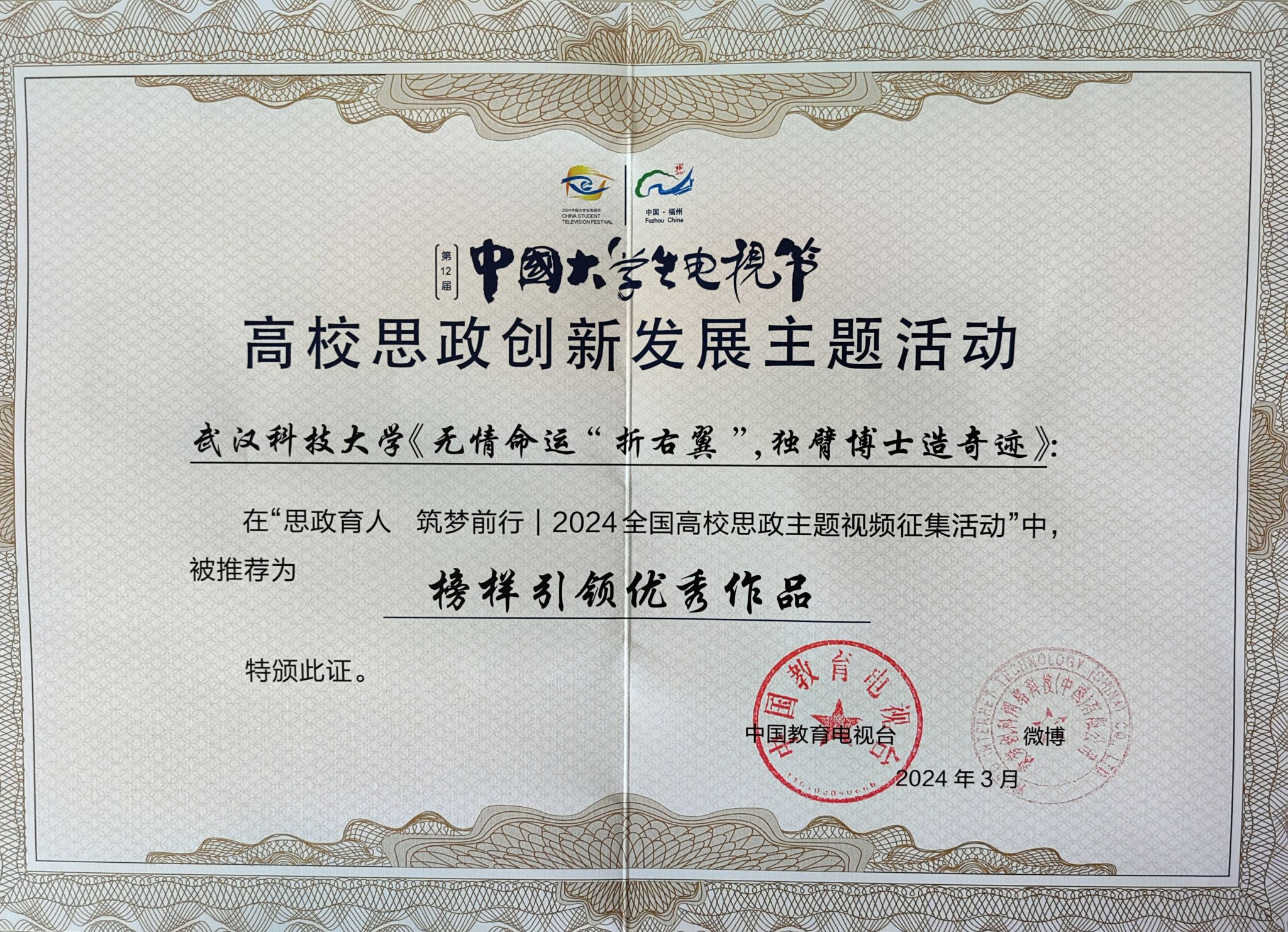 武科大网讯(记者韦春阳)在习近平总书记主持召开学校思想政治理论课教师座谈会并发表重要讲话五周年之际,近日,由中国教育高等学会、中国教育电视台、福建省教育厅和微博联合主办的第十二届中国大学生电视节“高校思政创新发展主题活动”在福州大学举行。鸭脖应邀参会,并荣获全国高校思政主题视频征集活动“榜样引领优秀作品”奖。