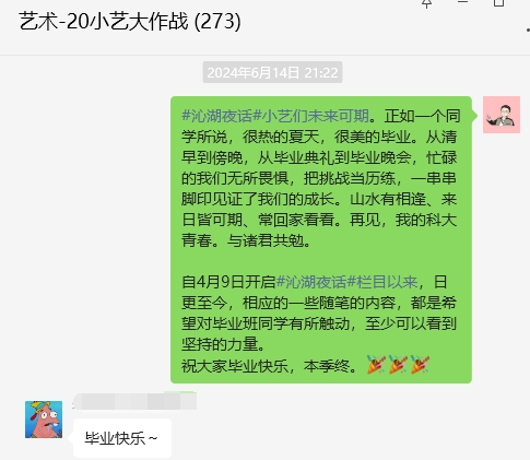 从“沁湖夜话”开创、发表的时候,就已经有一些经常和邹龙交流的学生感觉到了“异常”。“这是送我们离开的方式吗?还有两个多月,内容有点像孩子出门时的嘱托。”毕业生王梦思说道。现在停更后,学生们虽不舍,但纷纷表示会记牢邹龙的嘱托,在新的人生阶段接续努力。