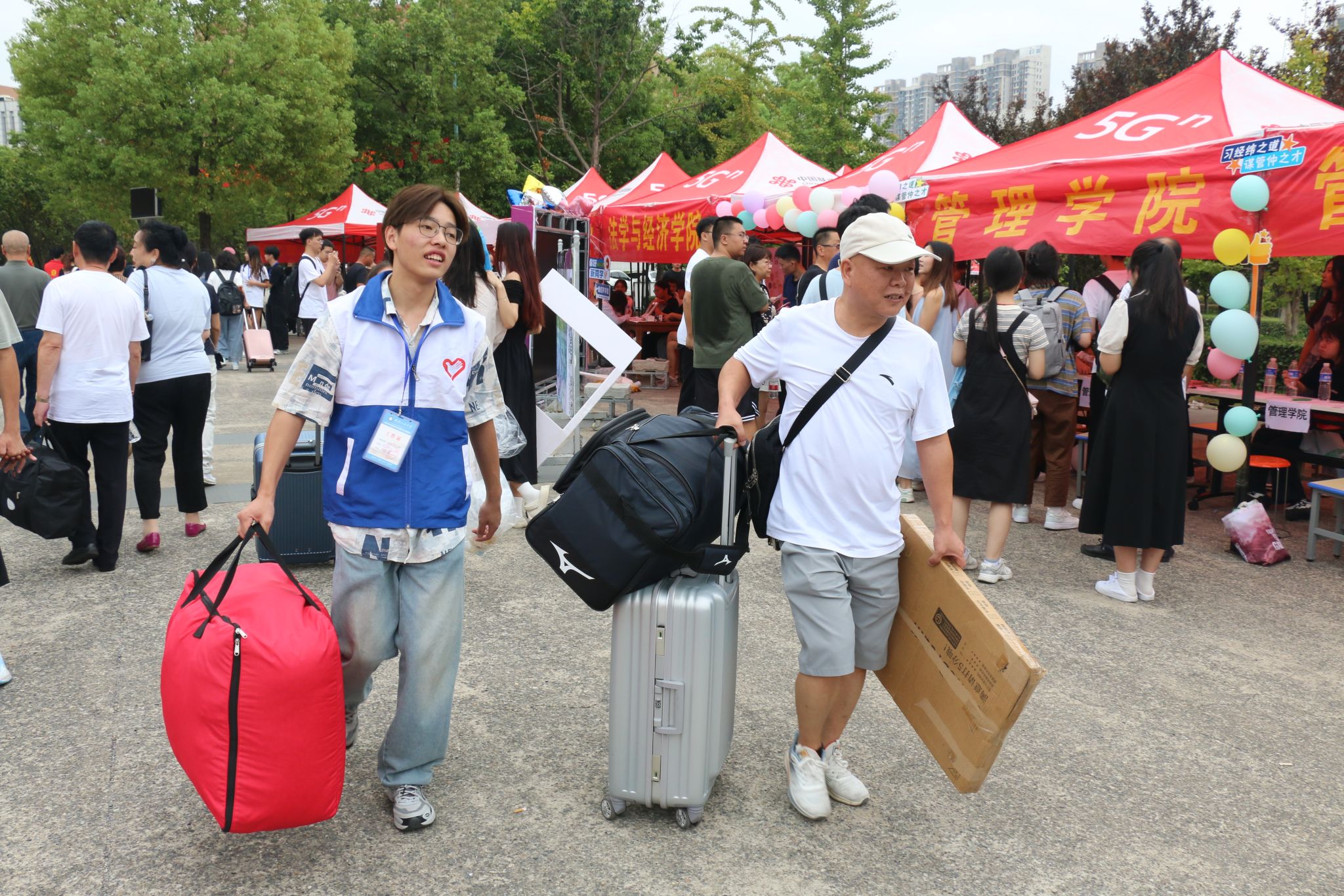 上午,南北园食堂设有学校团委的帐篷,以供家长和学生休息整顿。校社团管理部志愿者周钰涵和黄琳斐在帐篷处为家长提供咨询,负责行李搬运及看管、人员疏导等服务。大巴到达后,黄琳斐边卸下车上的行李边问道:“叔叔阿姨请问你们是哪个学院的呀?”并为他们指明对应学院的帐篷点位。同时,校社团管理部志愿者周悦将饮用水搬至帐篷处,方便路过的新生和家长饮用。