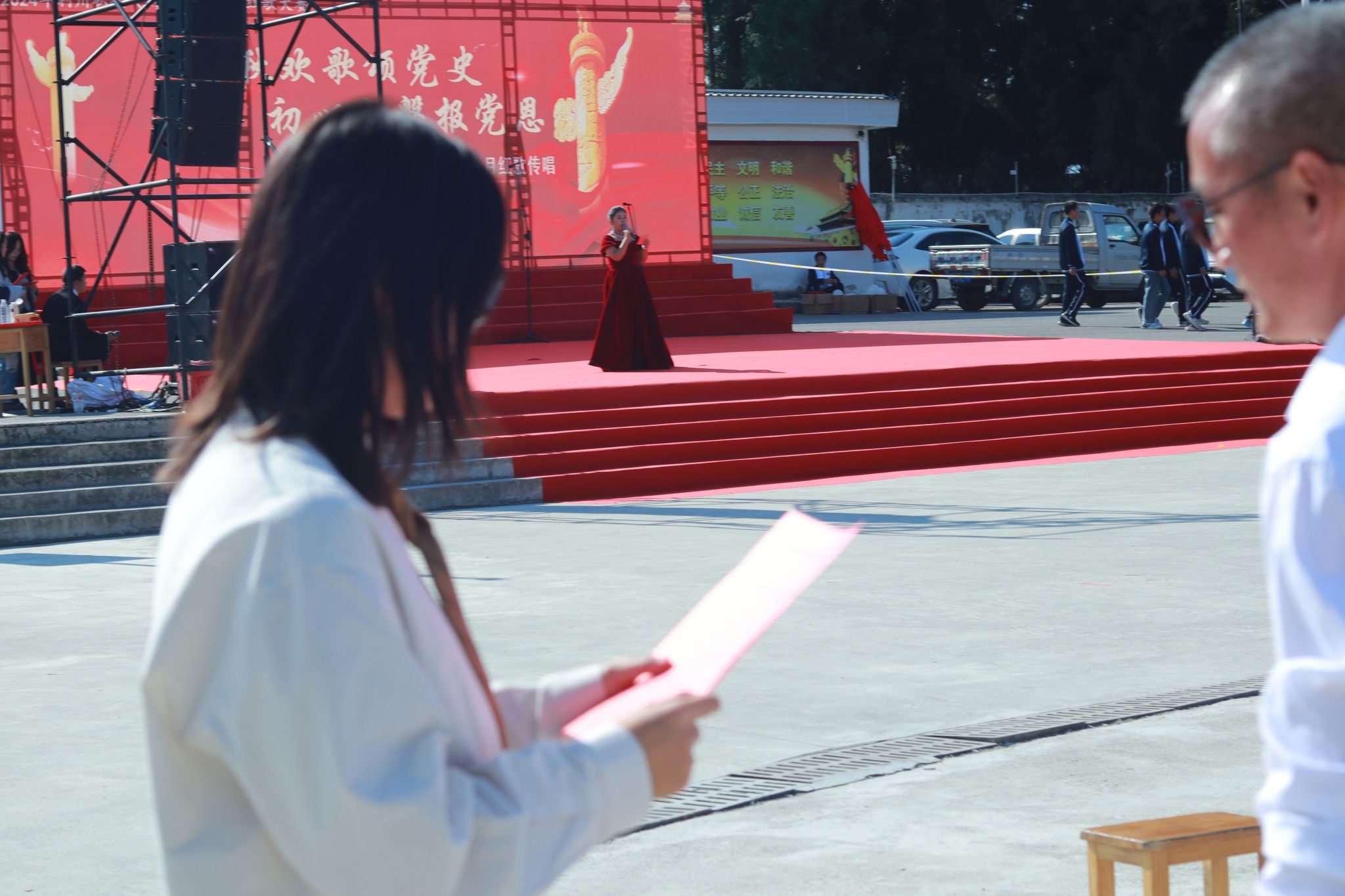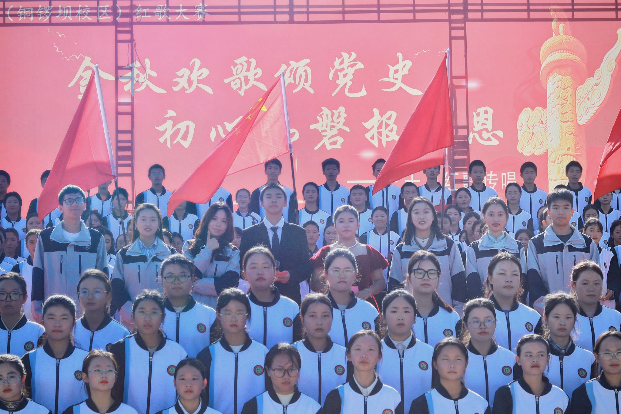 比赛形式是以班级为单位组织合唱,比赛正式开始后,各班级成员着装整齐、精神饱满;进出场整齐有序、台风良好。《我和我的祖国》《爱我中华》《大中国》......一首首红歌整齐嘹亮,响彻云霄。各班级为丰富表演形式,在演唱中穿插朗诵、舞蹈、舞龙舞狮、武术等表演,为观众们呈现了一场极具感染力的视听盛宴。比赛现场的音响控制、场控、统分、礼仪等方面都能看到研支团成员们的工作身影。
