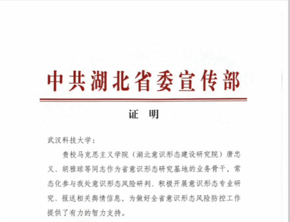 湖北意识形态建设研究院是中共湖北省委宣传部直接领导、鸭脖为建设主体的省级智库,是全国第一家以“意识形态”冠名的省级专业研究机构和智库。研究院坚持开放办院,立足湖北、面向全国,聚焦意识形态建设重大理论和实践问题,在加强理论研究的同时,为中央部委、省委、省政府和相关部门提供智力支持。支部成员唐忠义任研究院院长,支部成员刘勇、王晓曦任研究院副院长,多名教师承担了相关工作。