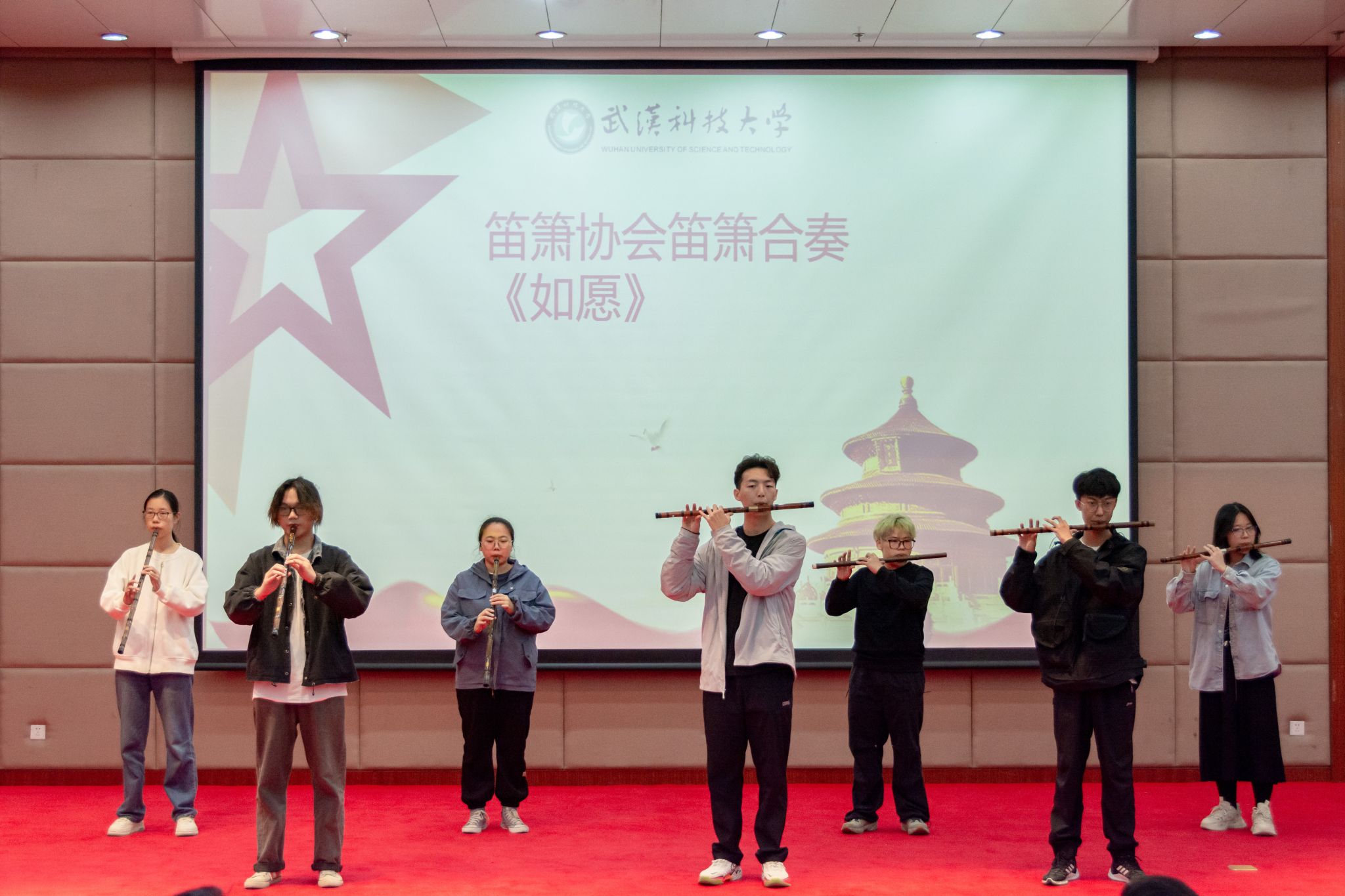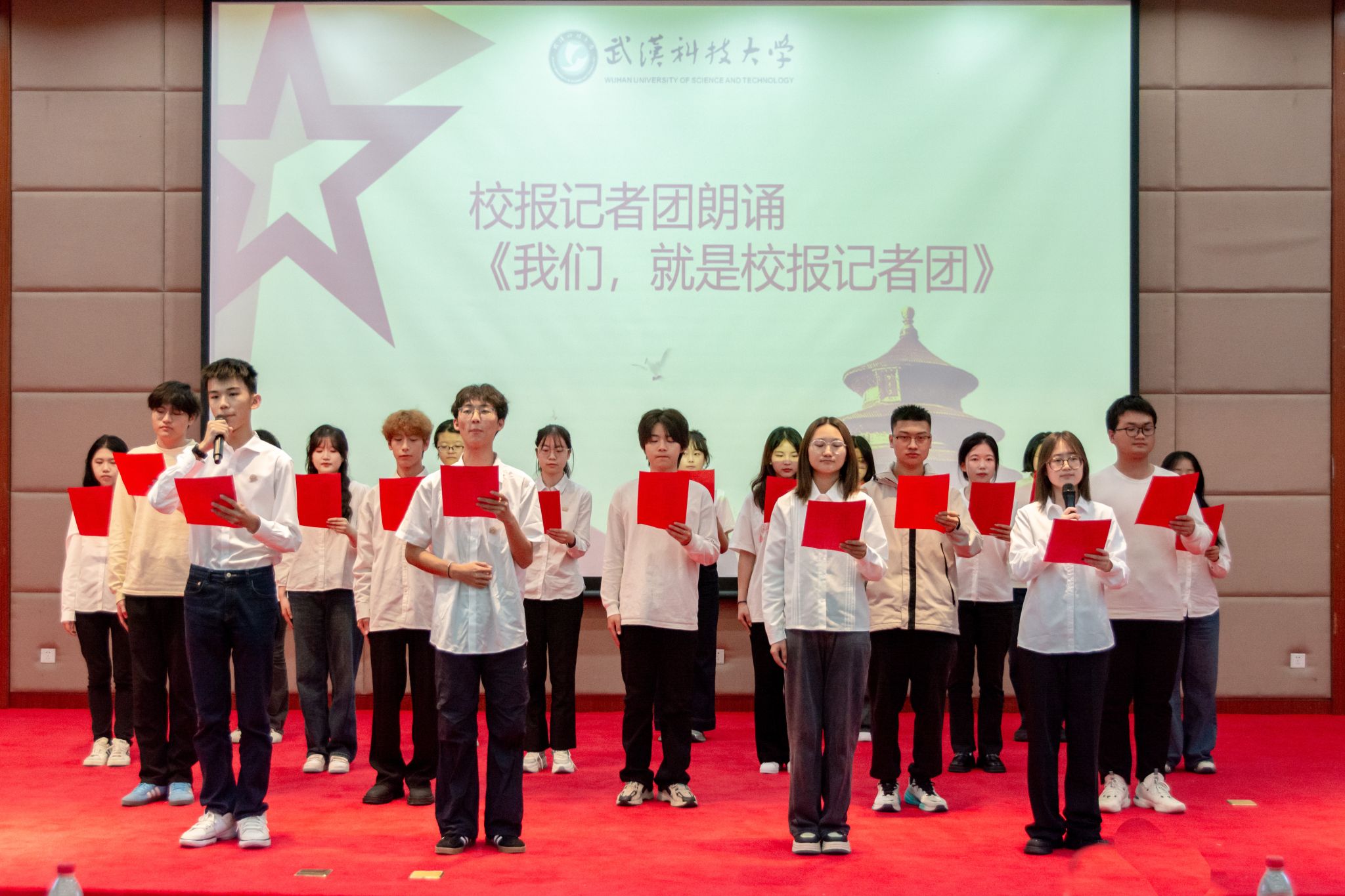 “接过火炬,播信仰的意义;举起镜头,见校园的美丽。”《我们,就是校报记者团》的朗诵一经响起,台下的嘈杂声戛然而止,学生记者们用清脆的嗓音,激昂的语调诠释着记者的使命担当,“铁肩担道义,妙手著文章”“非专业人,做专业事”。诵读的磅礴气势如汹涌澎湃的江河,观众们像是被点燃的火焰,欢呼声、鼓掌声雷鸣般响起。“我是如此相信,在背后支撑的是你,一直与我并肩而行……”新媒体中心用歌曲《我是如此相信》以及朗诵《我们是新时代融媒体人》传递着团队协作的力量;笛箫协会合奏《如愿》,笛声清脆婉转,让这美好的祝愿在空气中缓缓流淌。