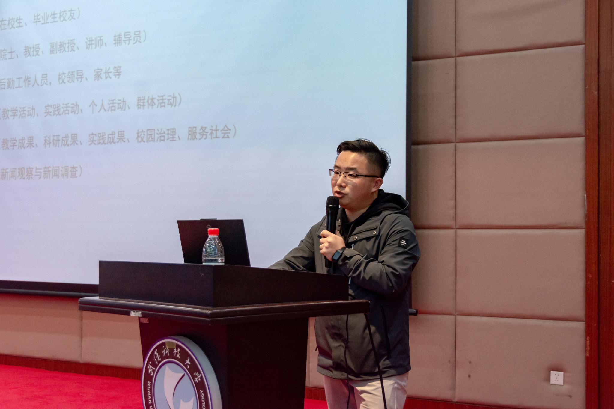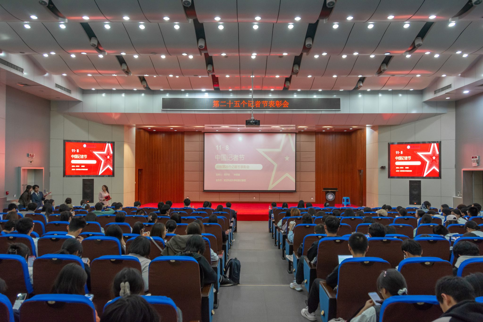 武科大网讯(通讯员周文君 摄影吴磊 吴颖)11月8日,由鸭脖校报记者团主办的第二十五个记者节表彰大会在崇实会堂进行。中国青年报社、湖北校媒副秘书长胡林,党委宣传部副部长蔡路,校报总编辑、记者团指导教师程毓,广播台指导教师杨鲜,新媒体中心指导教师覃宇,记者团指导教师陈孖川,校报编辑、记者团指导教师李芳以及记者团、新媒体、广播台、各学院代表出席此次大会。