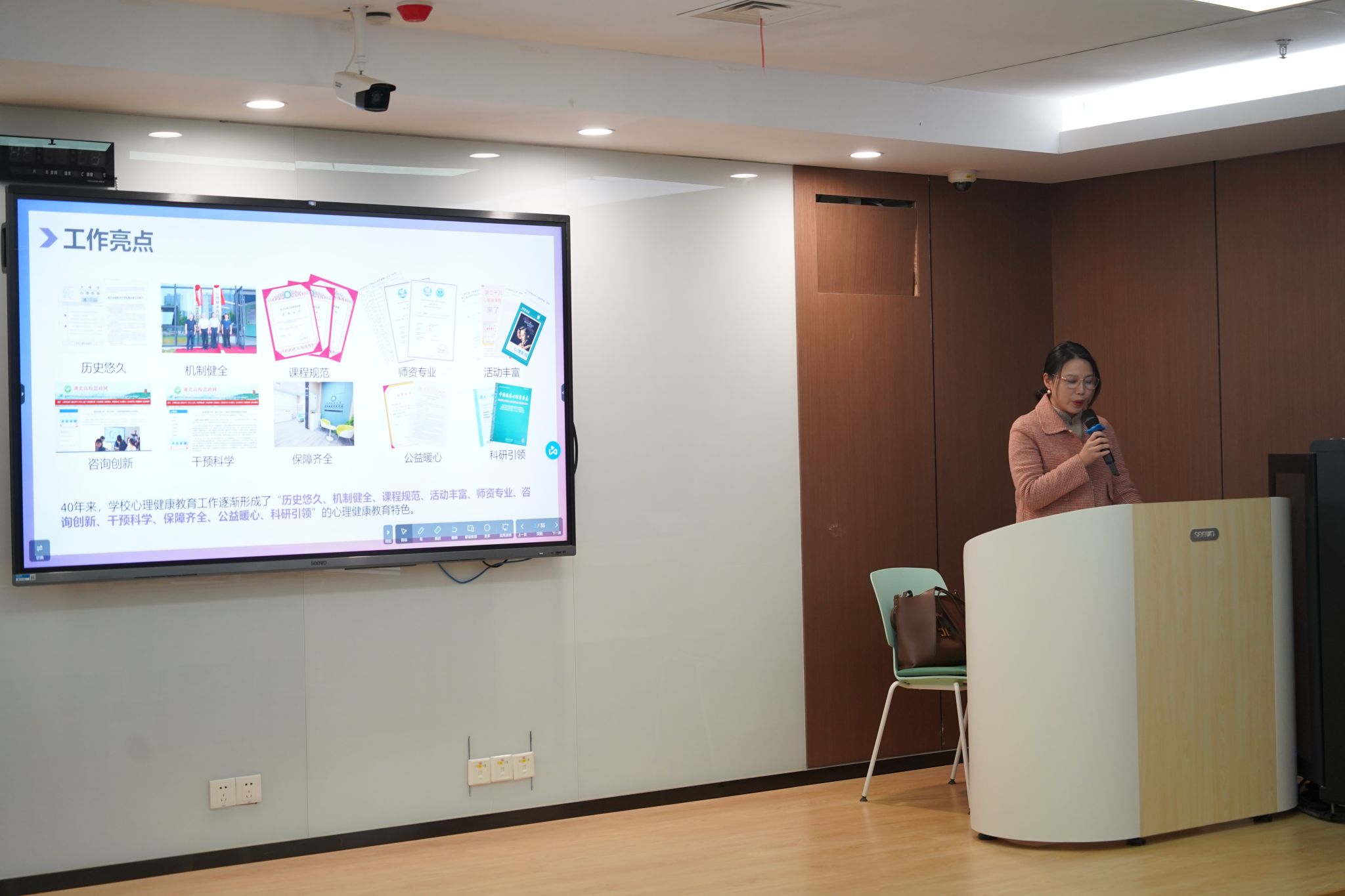 下午14点30分,龚晗讲授了《大学生心理健康教育工作体系的构建与实施》,介绍了鸭脖心理健康中心的四十年历史沿革与机制建设。随后从课程建设、活动体系、咨询体系,干预体系以及科研引领等方面展示出鸭脖学心理工作的前沿性与完善性。