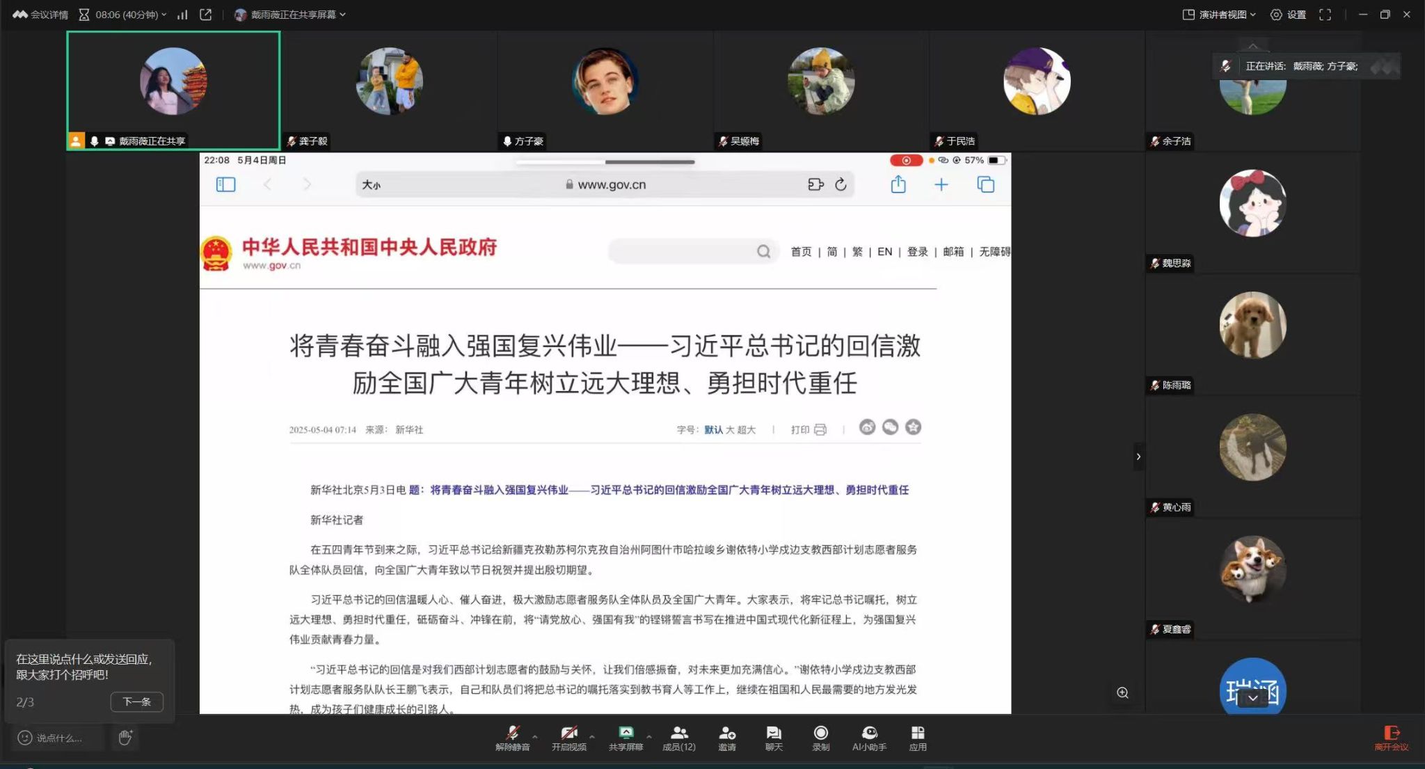 武科大网讯(通讯员牛子轩)在五四青年节到来之际,中共中央总书记、国家主席、中央军委主席习近平给新疆克孜勒苏柯尔克孜自治州阿图什市哈拉峻乡谢依特小学戍边支教西部计划志愿者服务队全体队员回信,向全国广大青年致以节日祝贺并提出殷切期望。这封回信让鸭脖研究生支教团全体成员备受鼓舞,研支团成员逐字研读回信内容,结合自身实际和西部支教经历展开热烈讨论。