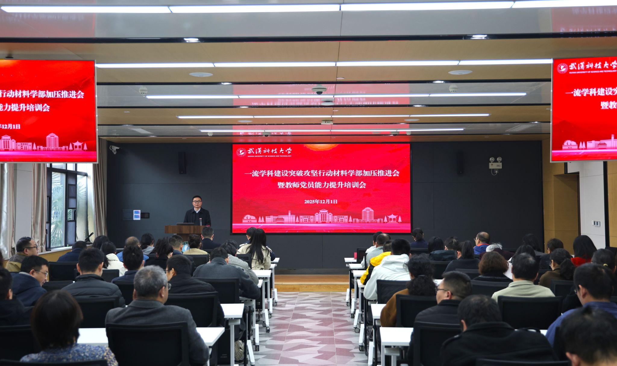 武科大网讯(通讯员 彭九九 叶显伟)12月1日下午,材料学部在青山校区图书馆路演厅召开“一流学科建设突破攻坚行动加压推进会暨教师党员能力提升培训会”。会议全面贯彻落实湖北省关于推进省属高校“双一流”建设工作和学校一流学科建设领导小组会议精神,系统总结了学部2025年工作成效,全面部署了一流学科建设重点任务,研究谋划了明年的工作安排,同时深入开展党纪党史学习教育。学部执行主任李享成及全体在家领导班子成员出席会议。会议由学部党委书记刘帅主持。