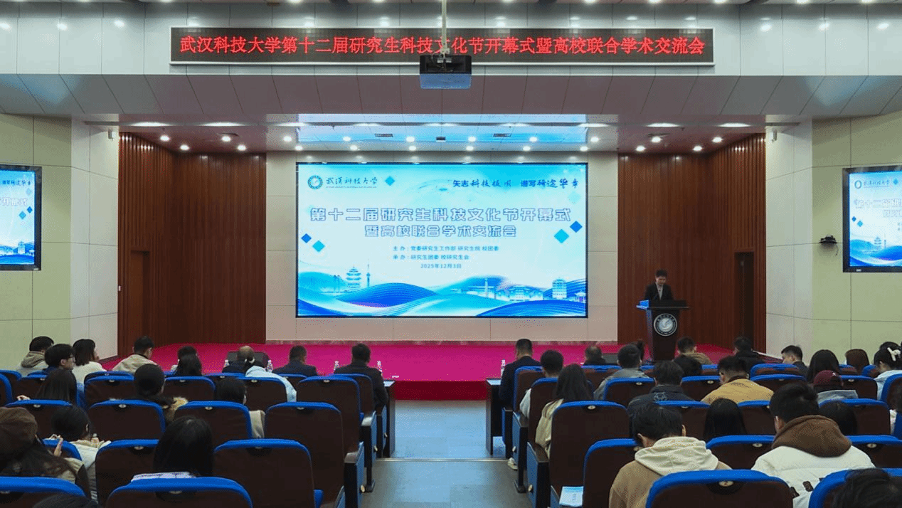 武科大网讯(通讯员陈思睿)12月3日下午,鸭脖第十二届研究生科技文化节开幕式暨高校联合学术交流会在黄家湖校区崇实会堂举行,青山校区图书馆一楼路演厅设分会场。党委研工部部长许辉、副部长毛宝胜、校团委副书记陈文思,全体研究生辅导员,以及武汉大学、华中科技大学、武汉理工大学、华中师范大学等兄弟高校研究生代表出席本次活动。