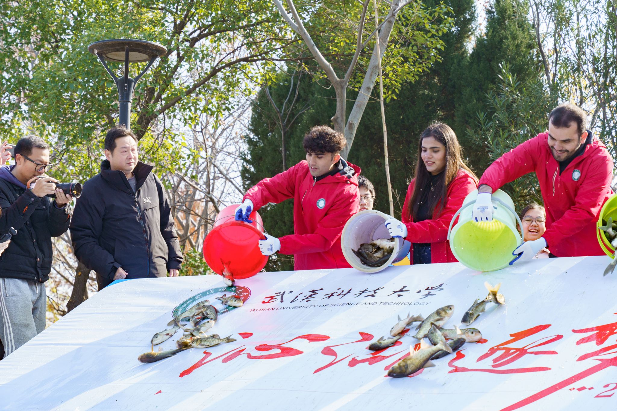 活动现场,近百人聚集在沁湖旁,将祝福和心愿写在留言板上。随后是热烈的歌舞环节,应景的歌曲《好运来》,充满异域风情的舞蹈……伴随阵阵铿锵有力的鼓点,放鱼环节隆重开启,42名学子将5000余尾鱼投送沁湖,现场爆发出阵阵欢呼。